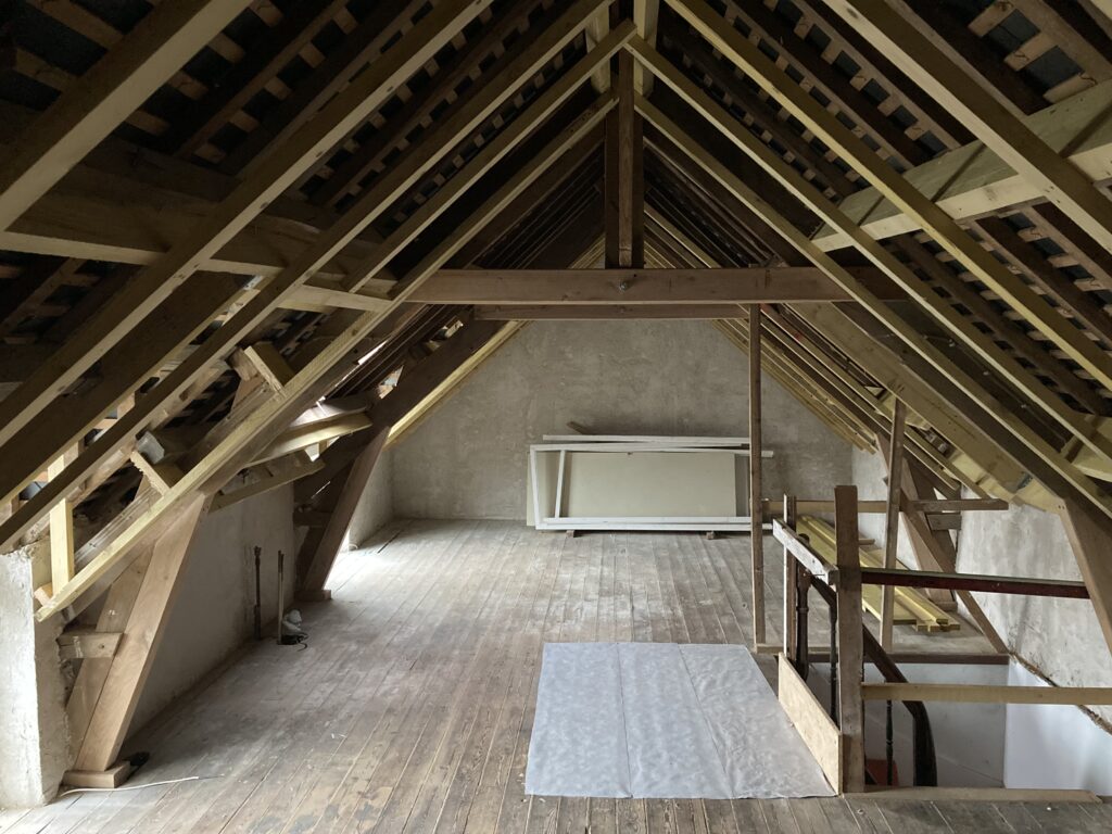 Modification de charpente dans « LA GRANDE MAISON » à Redon dans le cadre de sa réhabilitation en logement collectif. Dans les combles, réhausse des entraits des fermes, renforcement des pieds de fermes, réhausse des entraits de la ferme de noue, renfort des lucarnes et contre-chevronnage.