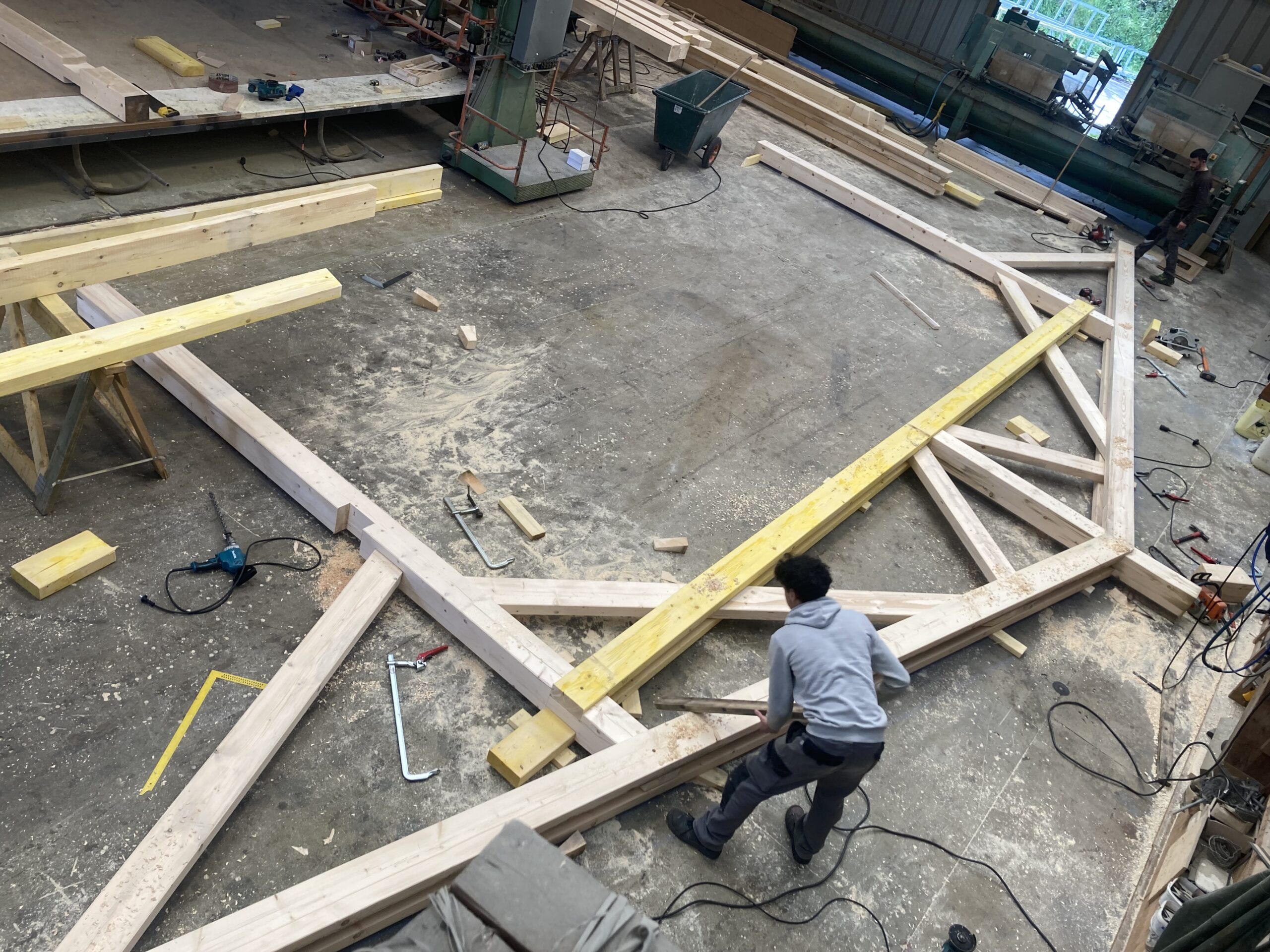 Constituée de 4 fermes sur poteaux, en bois traité à cœur, la charpente a été taillée et assemblée à blanc dans nos ateliers.