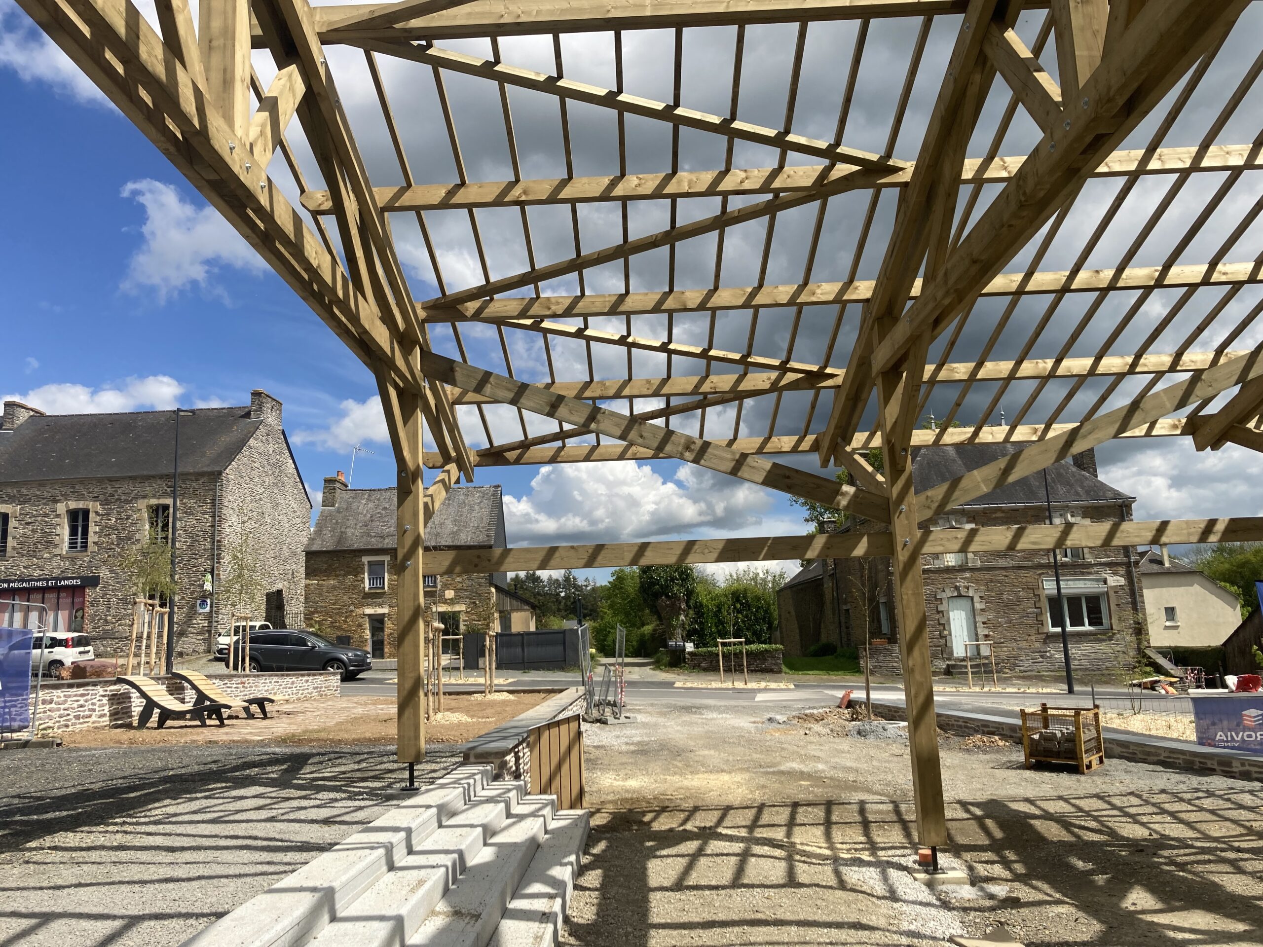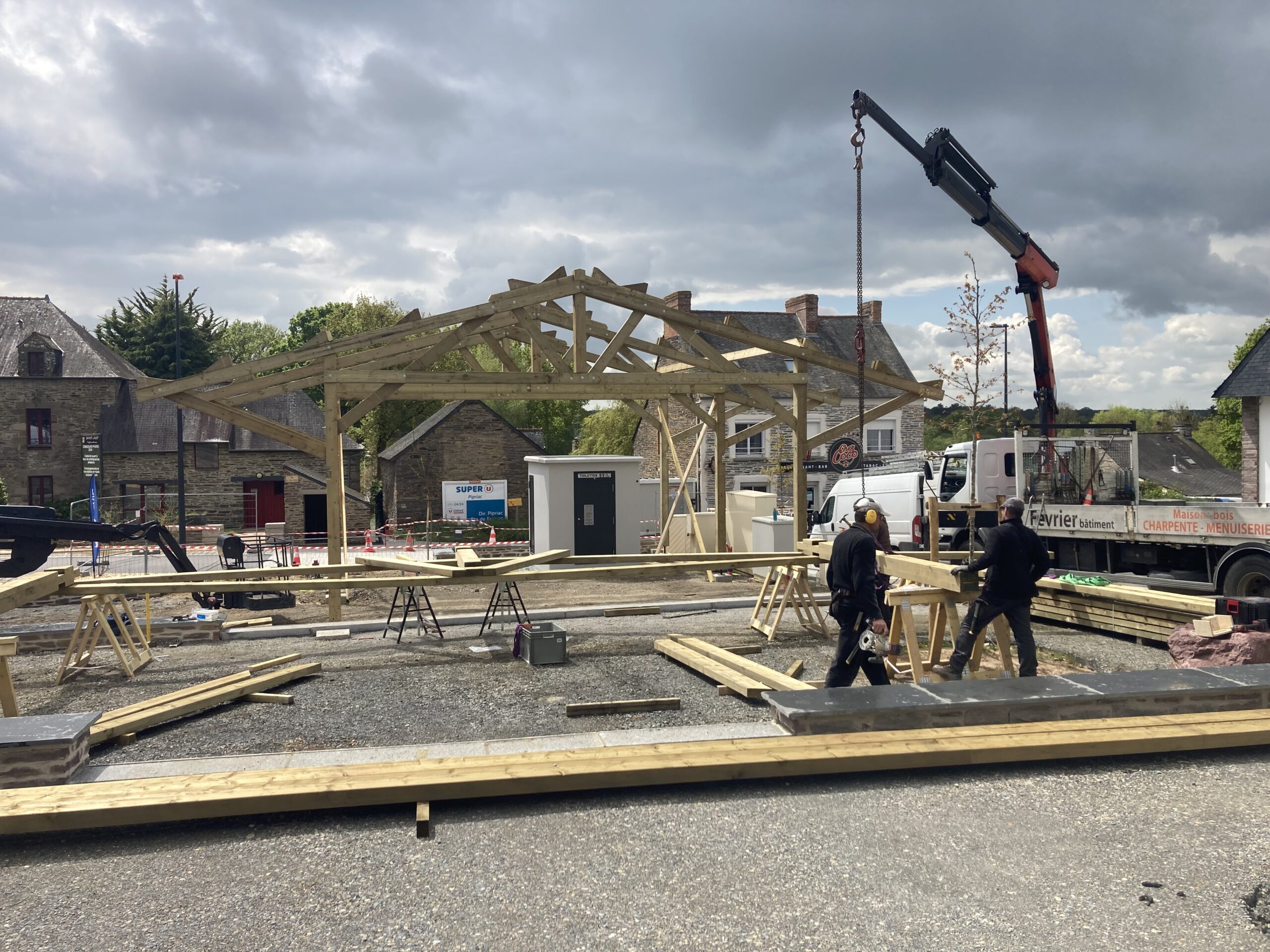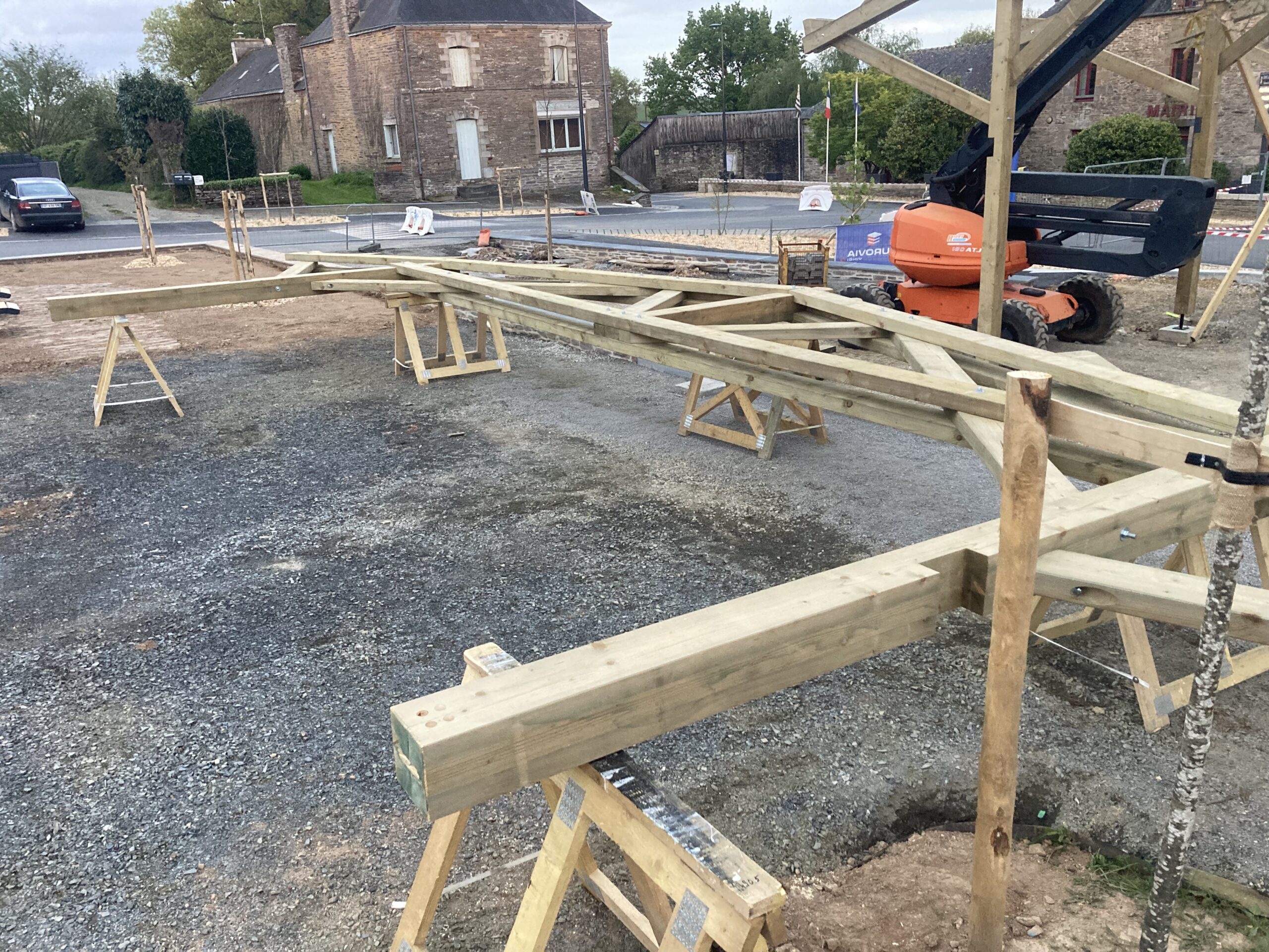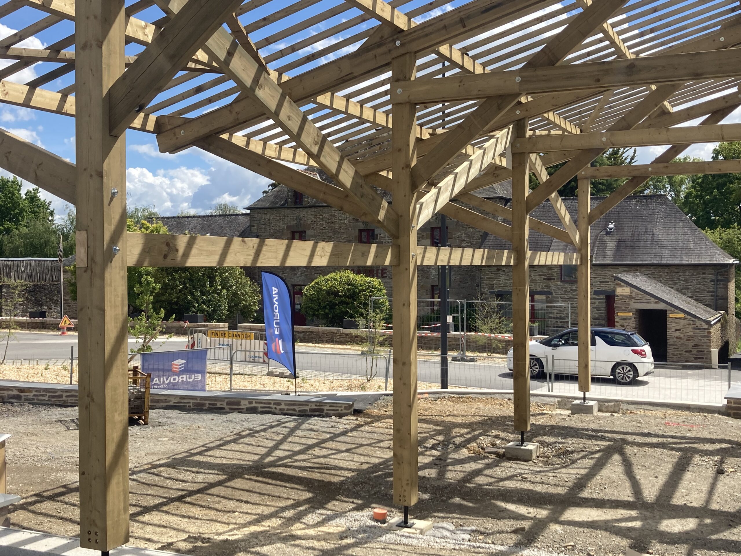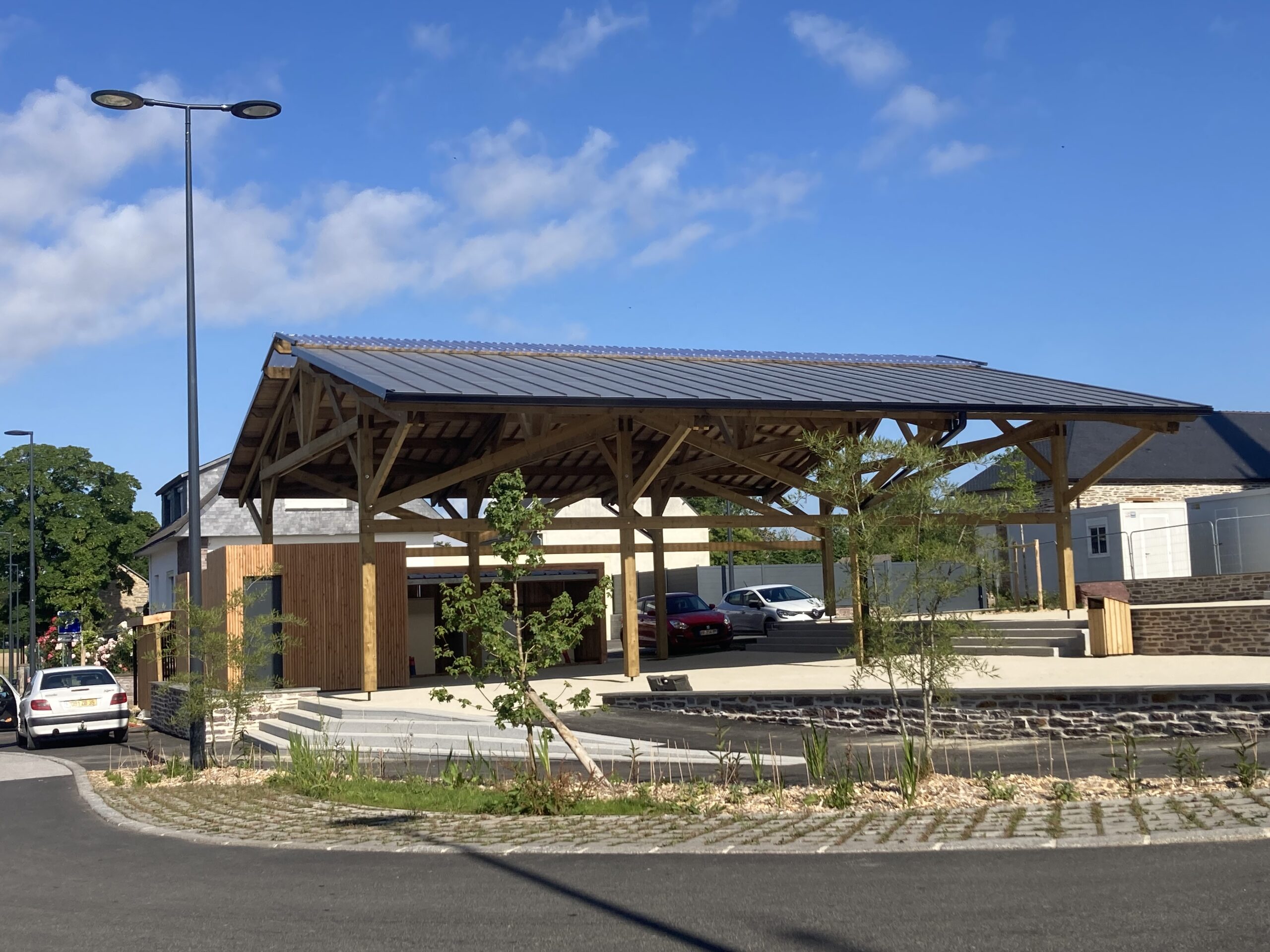 Dans le cadre l’aménagement général de la place de l’Église et centrale du centre-bourg de Saint-Just (Ille-et-Vilaine), la réalisation de cette halle ouverte s’est retrouvée accélérée par l’événement du passage de la flamme olympique en 2024. Elle couvre près de 200 m2 au sol et été inaugurée le 31/08/2024.