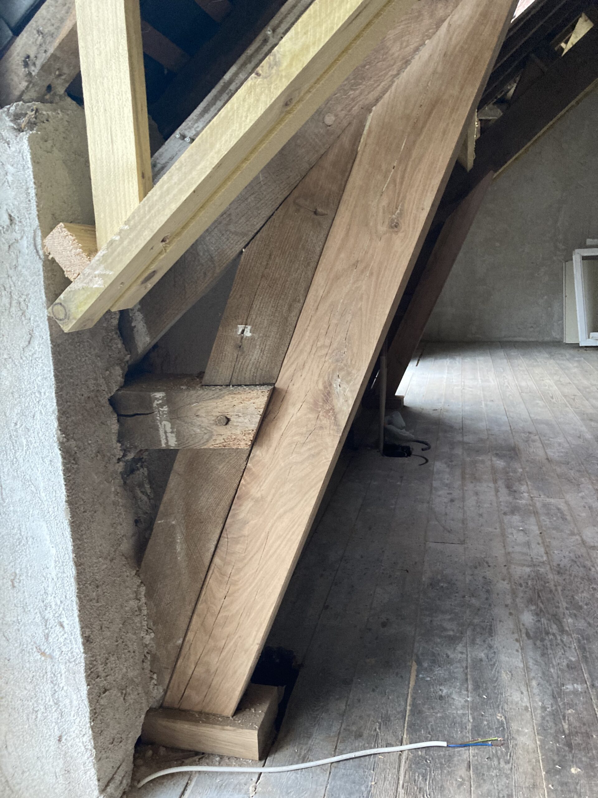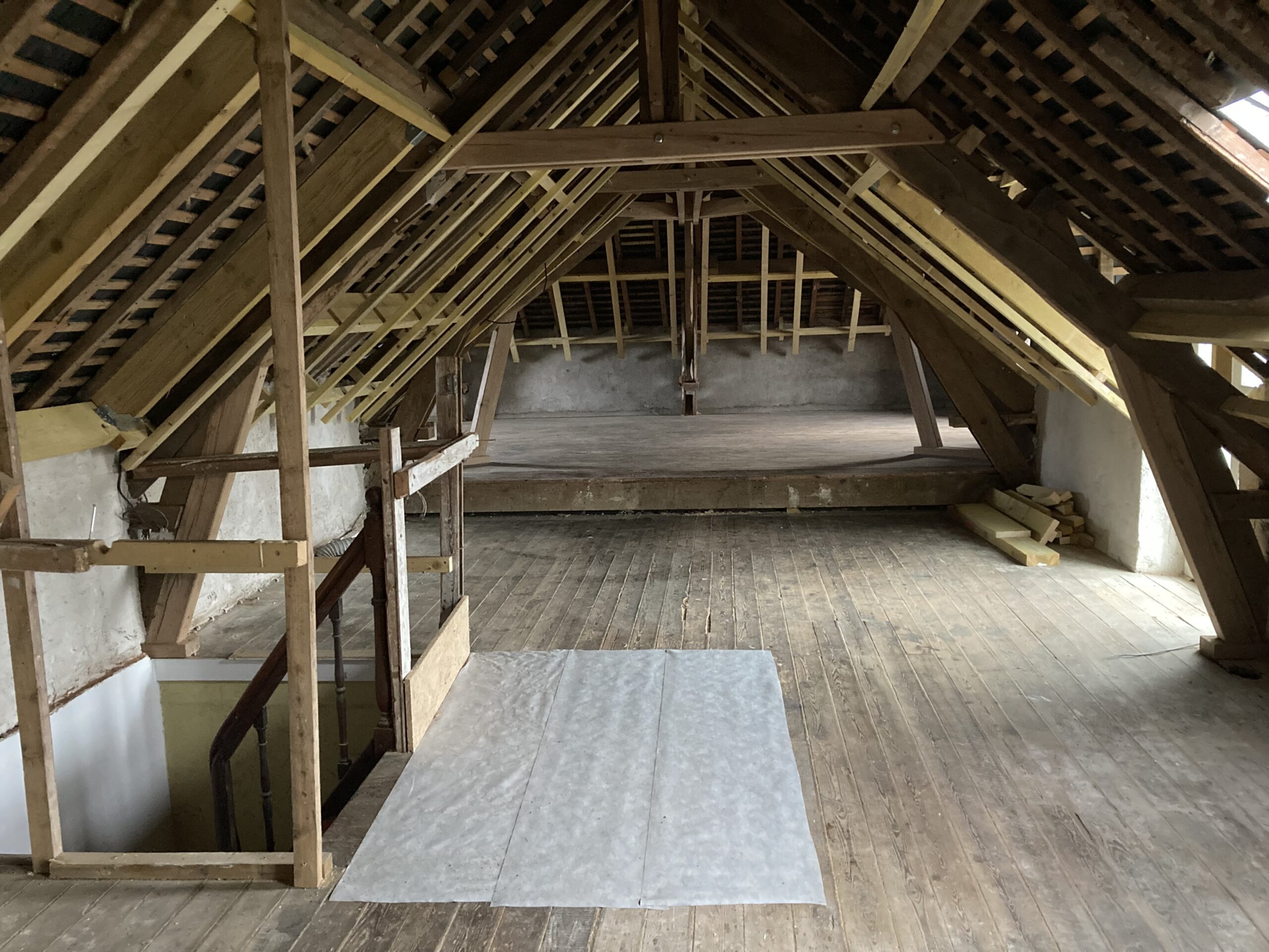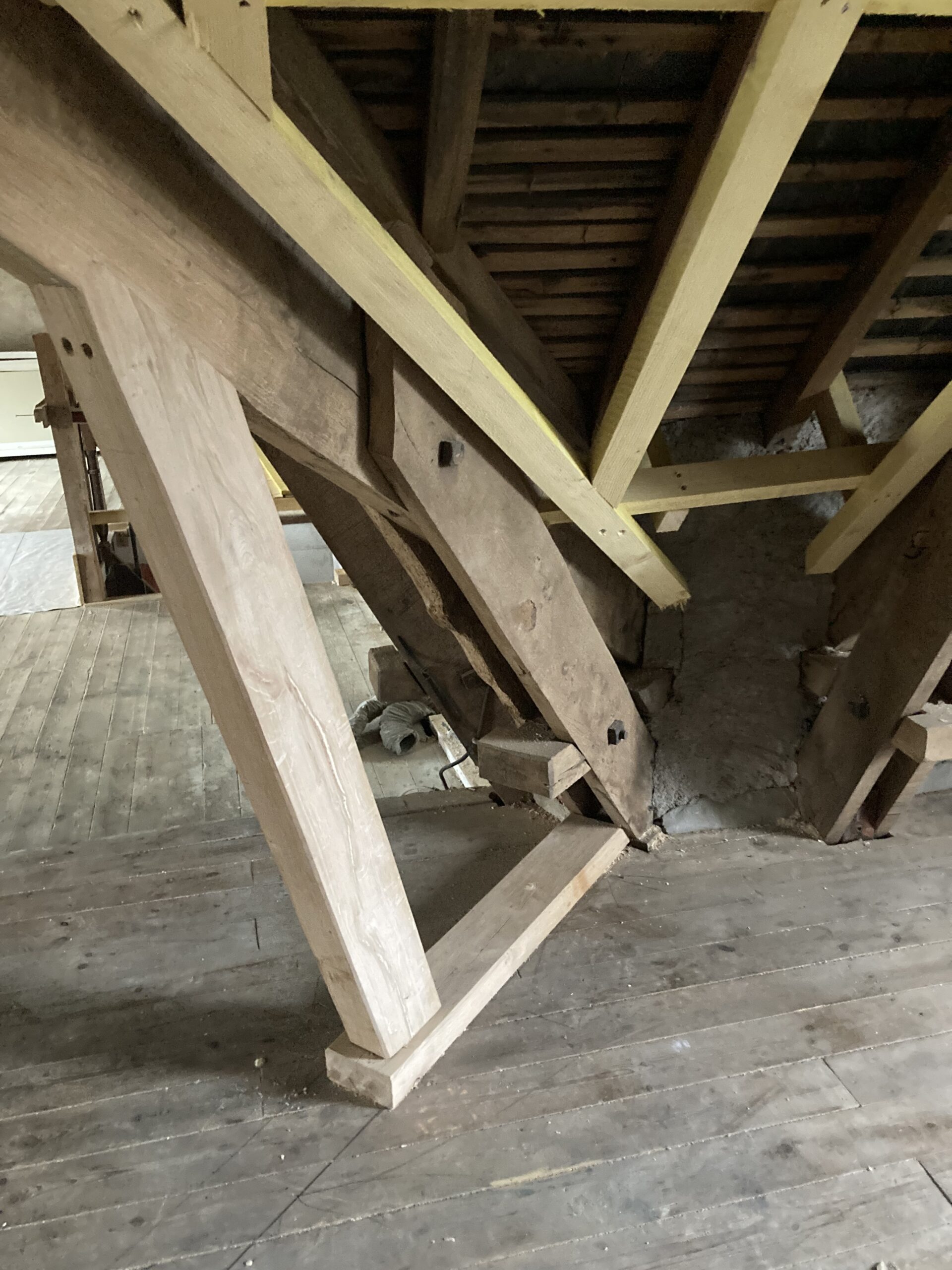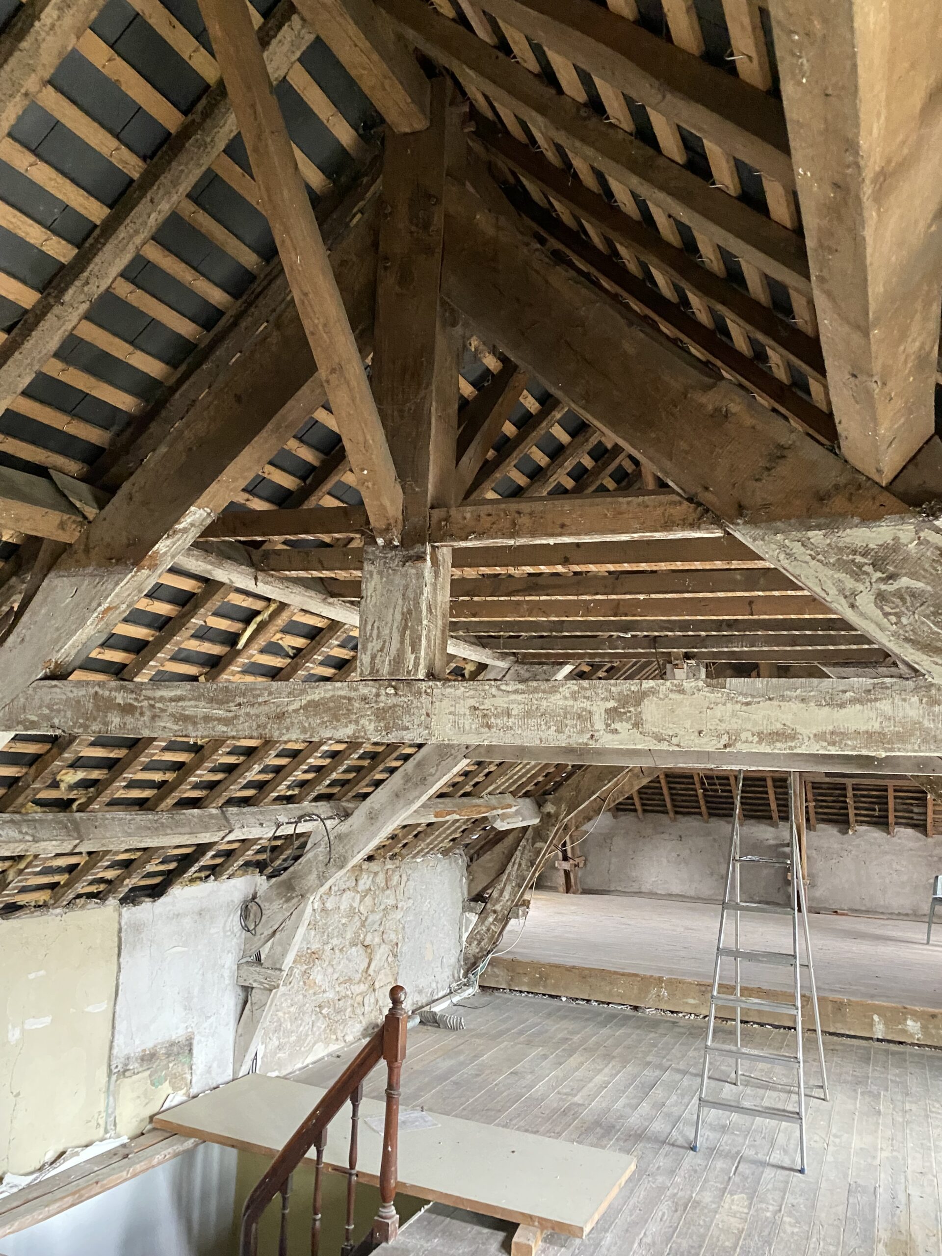 Modification de charpente dans « LA GRANDE MAISON » à Redon dans le cadre de sa réhabilitation en logement collectif. Dans les combles, réhausse des entraits des fermes, renforcement des pieds de fermes, réhausse des entraits de la ferme de noue, renfort des lucarnes et contre-chevronnage.