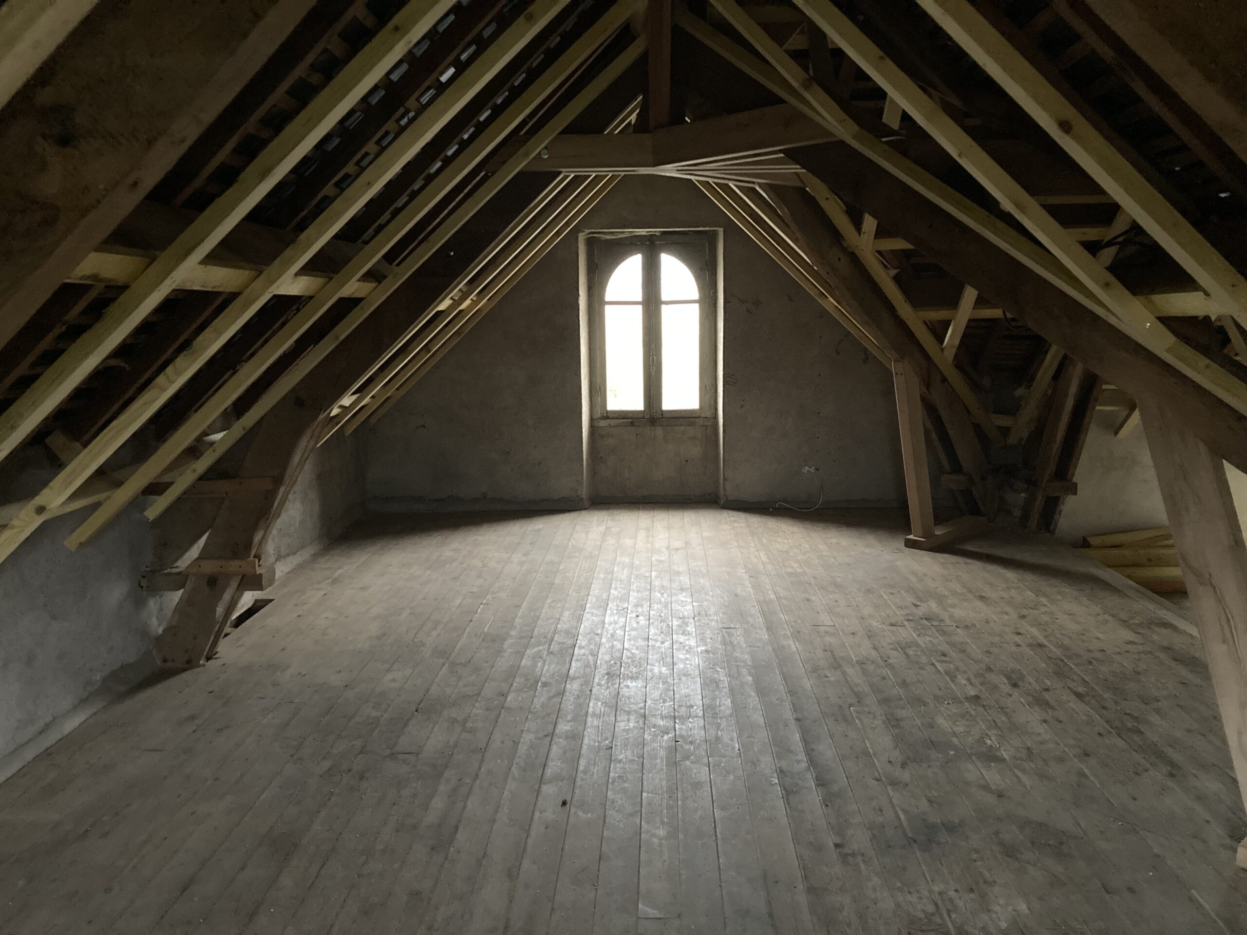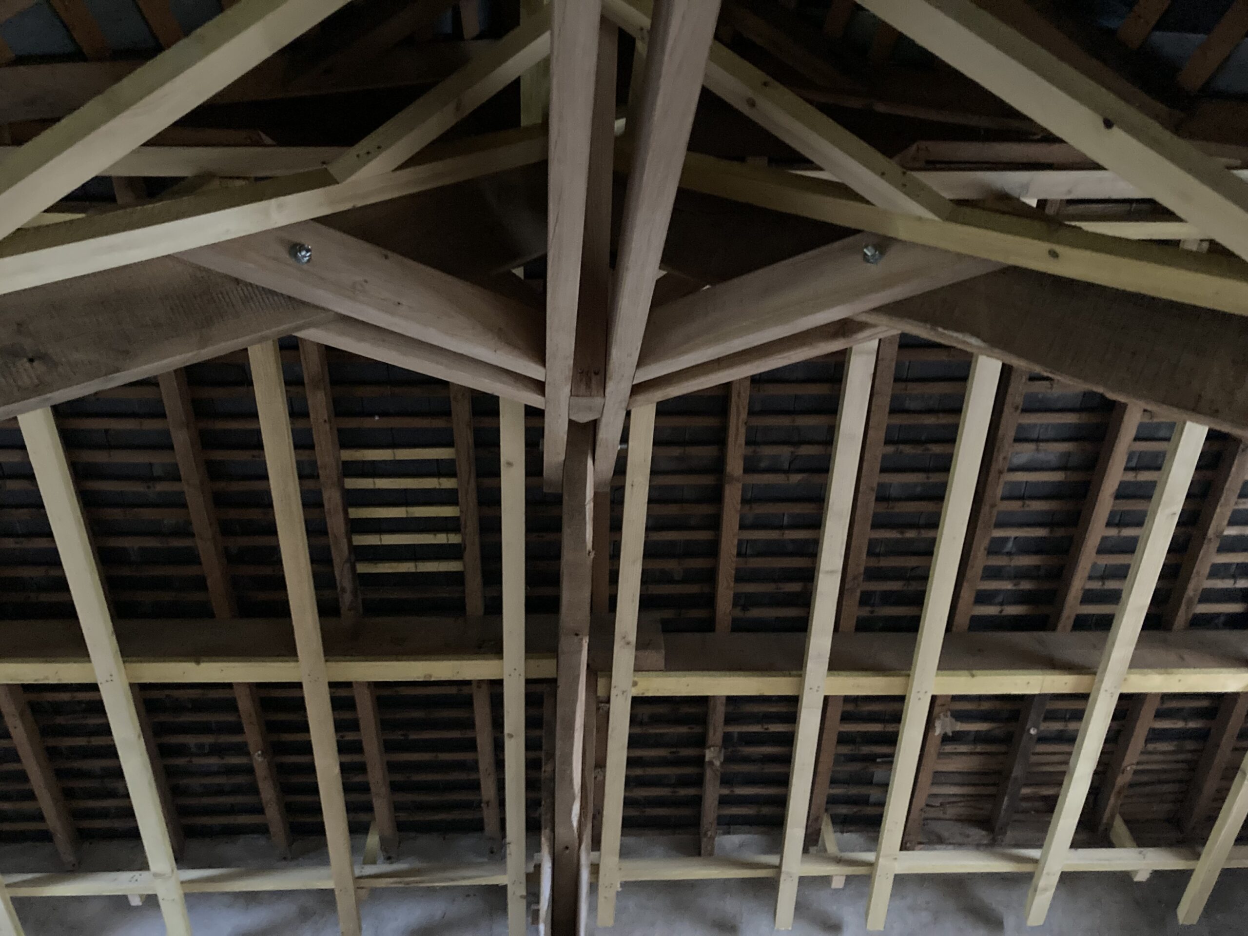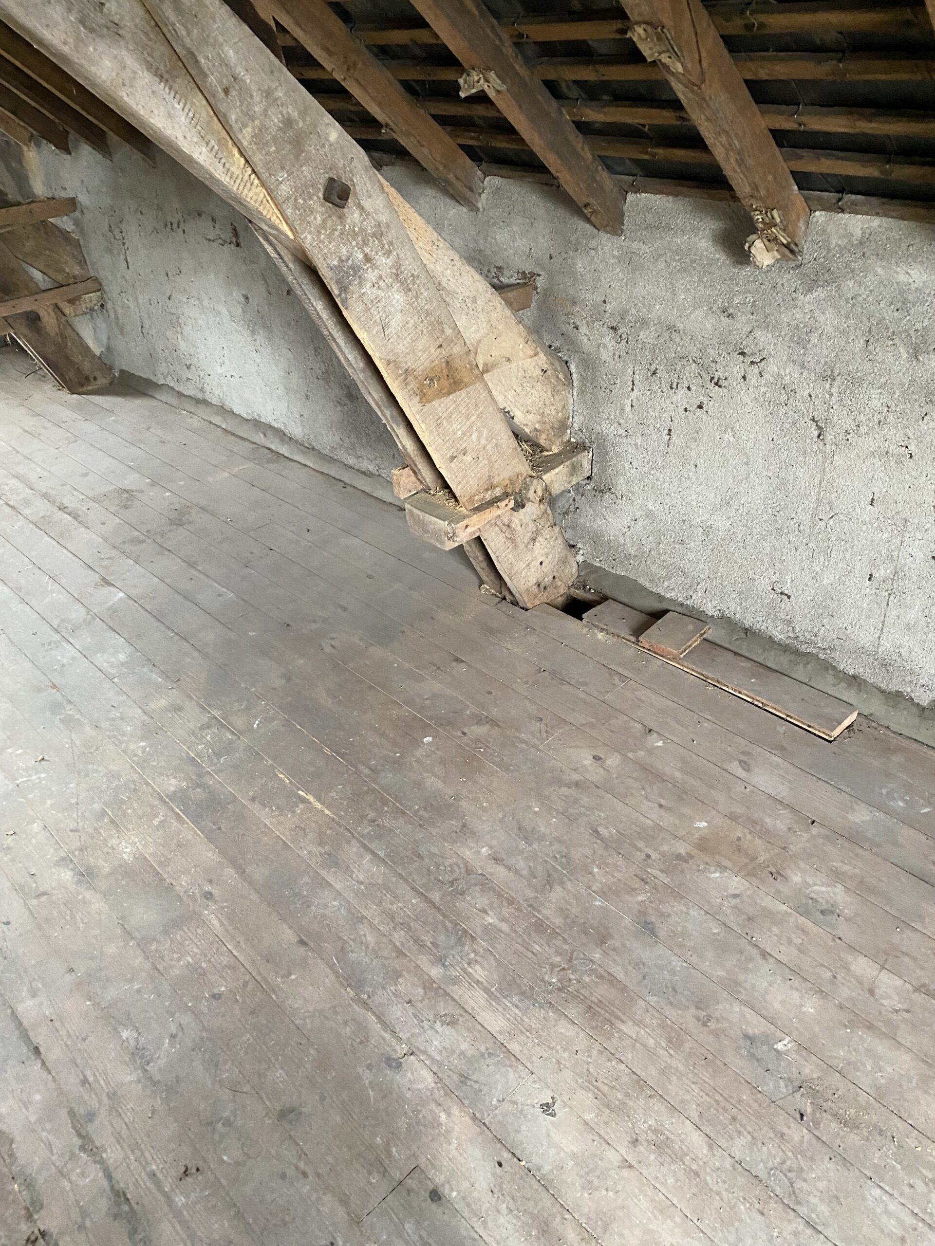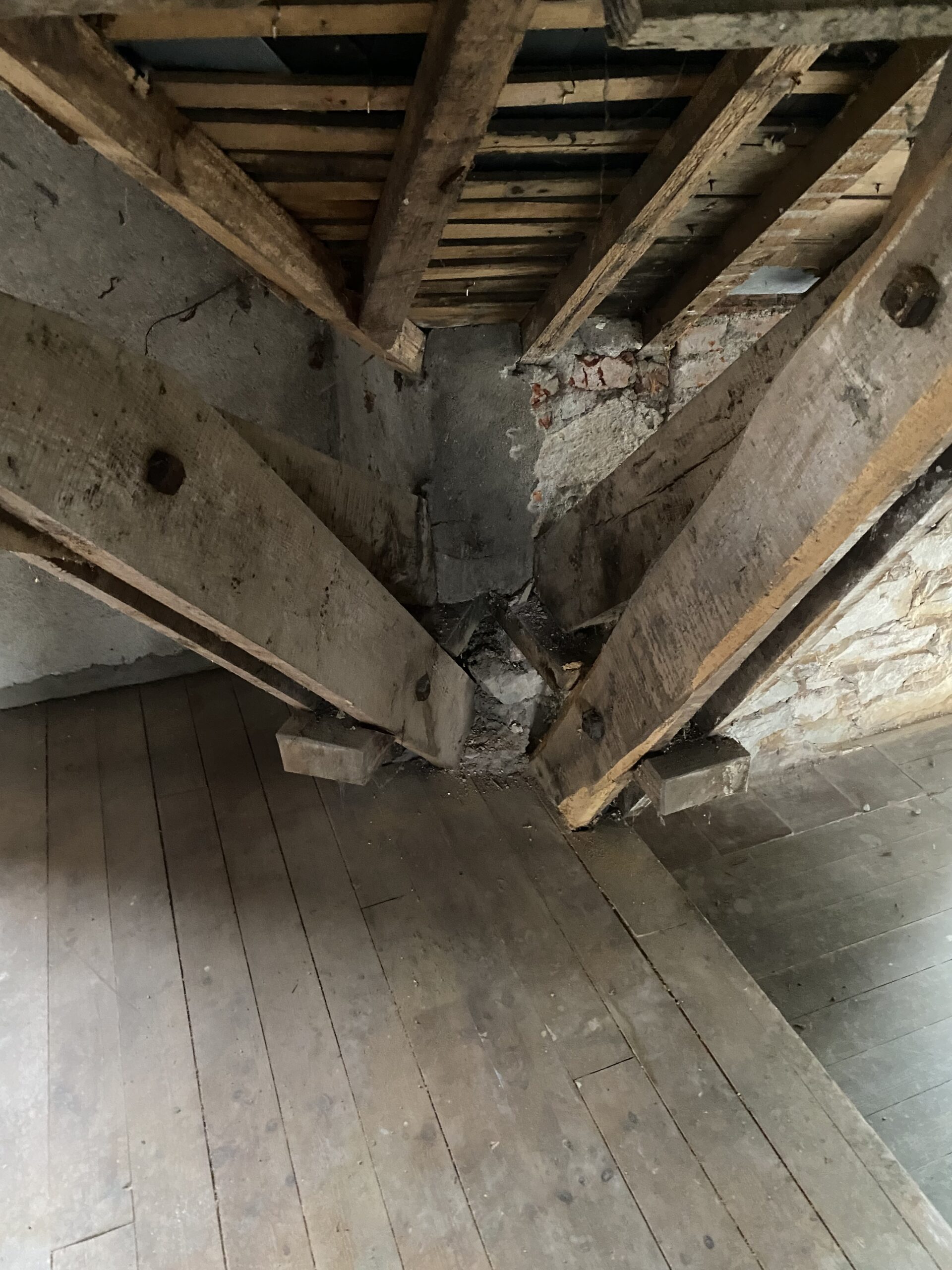 Modification de charpente dans « LA GRANDE MAISON » à Redon dans le cadre de sa réhabilitation en logement collectif. Dans les combles, réhausse des entraits des fermes, renforcement des pieds de fermes, réhausse des entraits de la ferme de noue, renfort des lucarnes et contre-chevronnage.